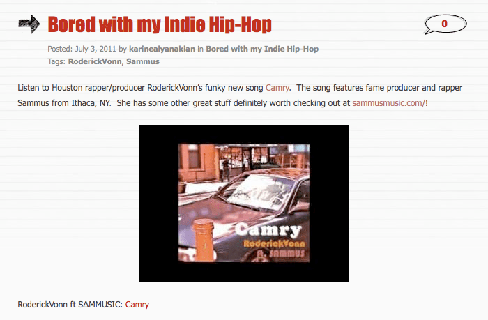 Hey world! RoderickVonn’s new song Camry [featuring Sammus] has made it’s way to the blog [Bored with my Music], a site devoted to sharing new music from artists that walk to the beat of their own 808s. Definitely make sure you check out the post and comment, in addition to the other posts on the site.