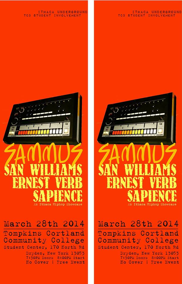 I’m coming up in the world ya’ll! I’ll be headlining an Ithaca Underground sponsored rap show on March 28th at the TC3 Student Center [170 North Road, Dryden NY] with some of my favorite local artists: San Williams, Ernest Verb, and Sapience (kind of wish Ernest Verb’s name started with an S lol). Show starts at 8:00 and it’s TOTALLY FREE, so I better see you there. RSVP HERE on facebook and I’ll see you there!