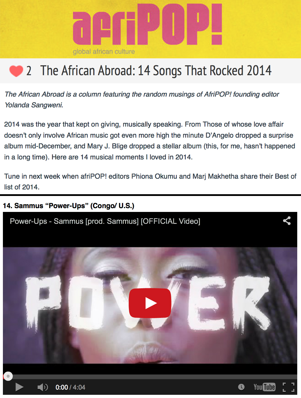 My dreams of taking my brand of black girl nerd raps to the Motherland are coming to fruition! The music video for my Metroid-inspired track “Power-Ups” was recently featured in AfriPOP! magazine’s year-end list: “The African Abroad: 14 songs that rocked 2014.” I’m so honored to be sharing this list with amazing artists like fellow Congolese rapper Well$ and Liberian singer/rapper Mapei, whom I used to blast back when I first started rapping in ’09. To see the full list head HERE and then make sure you leave a comment.