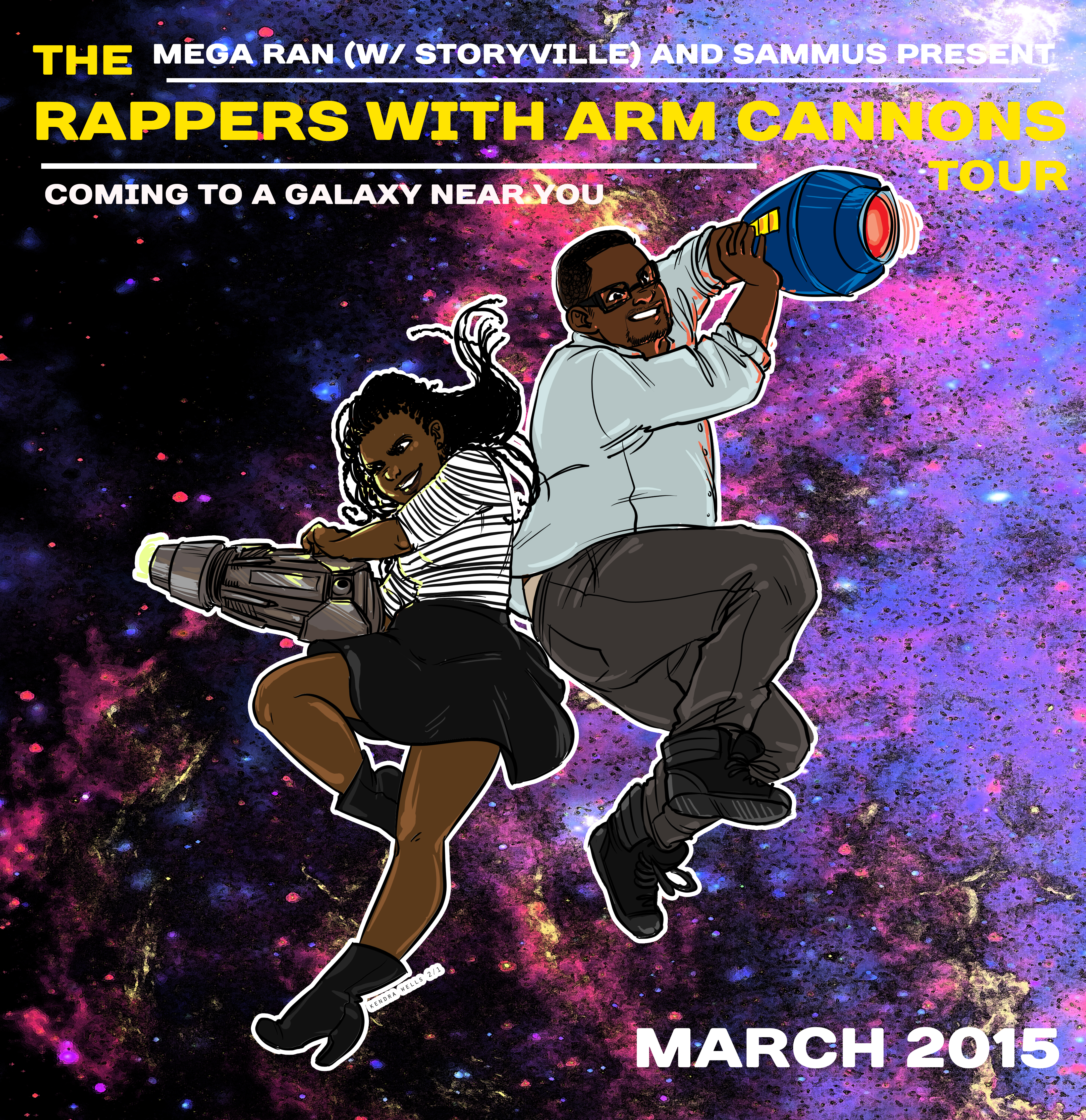 If you haven’t checked my Facebook already, I have an amazing announcement! In March I will FINALLY be going on my first tour! That’s right — Mega Ran [with Storyville] has graciously helped me to plan the logistics and will be joining me on the aptly titled: “Rappers with Arm Cannons Tour.” We’ll be moving from the Northeast through the Midwest down to Austin, TX where I’ll be performing at my first South by Southwest! Words can’t describe how excited I am! Details will be going up HERE (including where we decide to go for our one TBA show on the 11th) so check back if you want to catch us! Shout-out to the real MVP, Kendra Wells, for the awesome artwork you see below — hope to see you on the road!