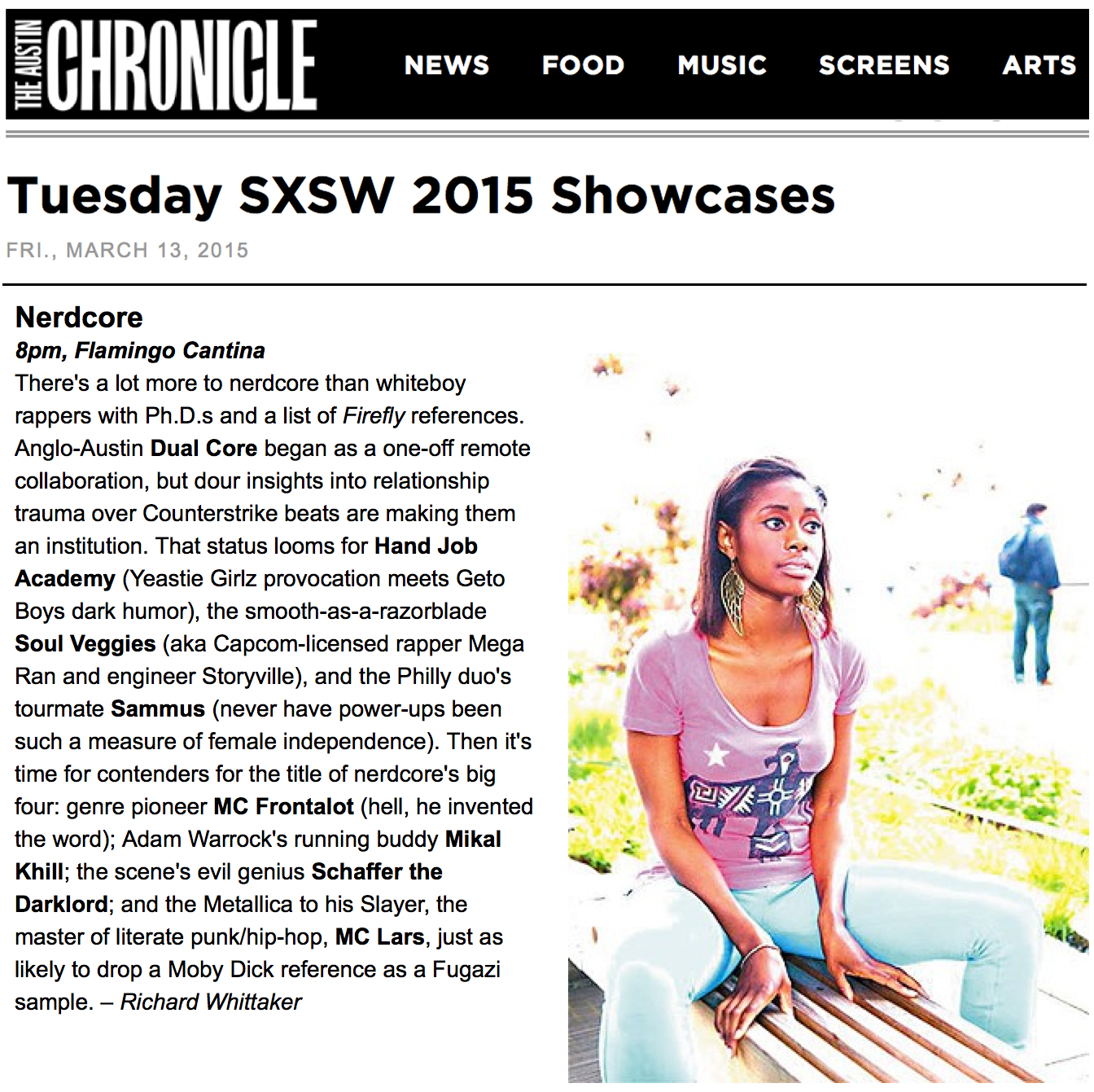 As SXSW approaches, my life has been feeling more and more surreal. I can’t believe I’m receiving so much support just for talking about the games and cartoons that shaped my life! The most recent surreal moment came this past Thursday while I was hanging out in a coffee shop in Cincinnati before a show (after a photo shoot) and the homie Mega Ran shared the news that I was in the Austin Chronicle. That’s right, according to the Chronicle: “never have power-ups been such a measure of female independence.” How fresh is it that a black woman is sitting pretty as the face of nerdcore at SXSW (at least according to the Chronicle)? Check out the full write-up here and then make sure you plan to come see it all go down on Tuesday!